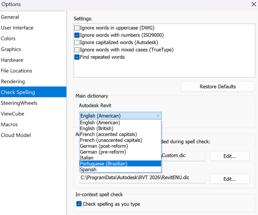 O REVIT 2026.3 introduz a capacidade de a verificação ortográfica poder ser realizada em português (do Brasil). Para tal, selecione o correspondente dicionário através da função OPTIONS.
